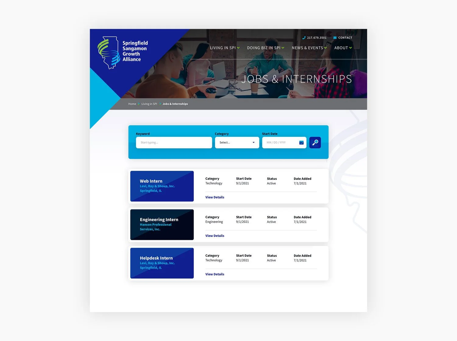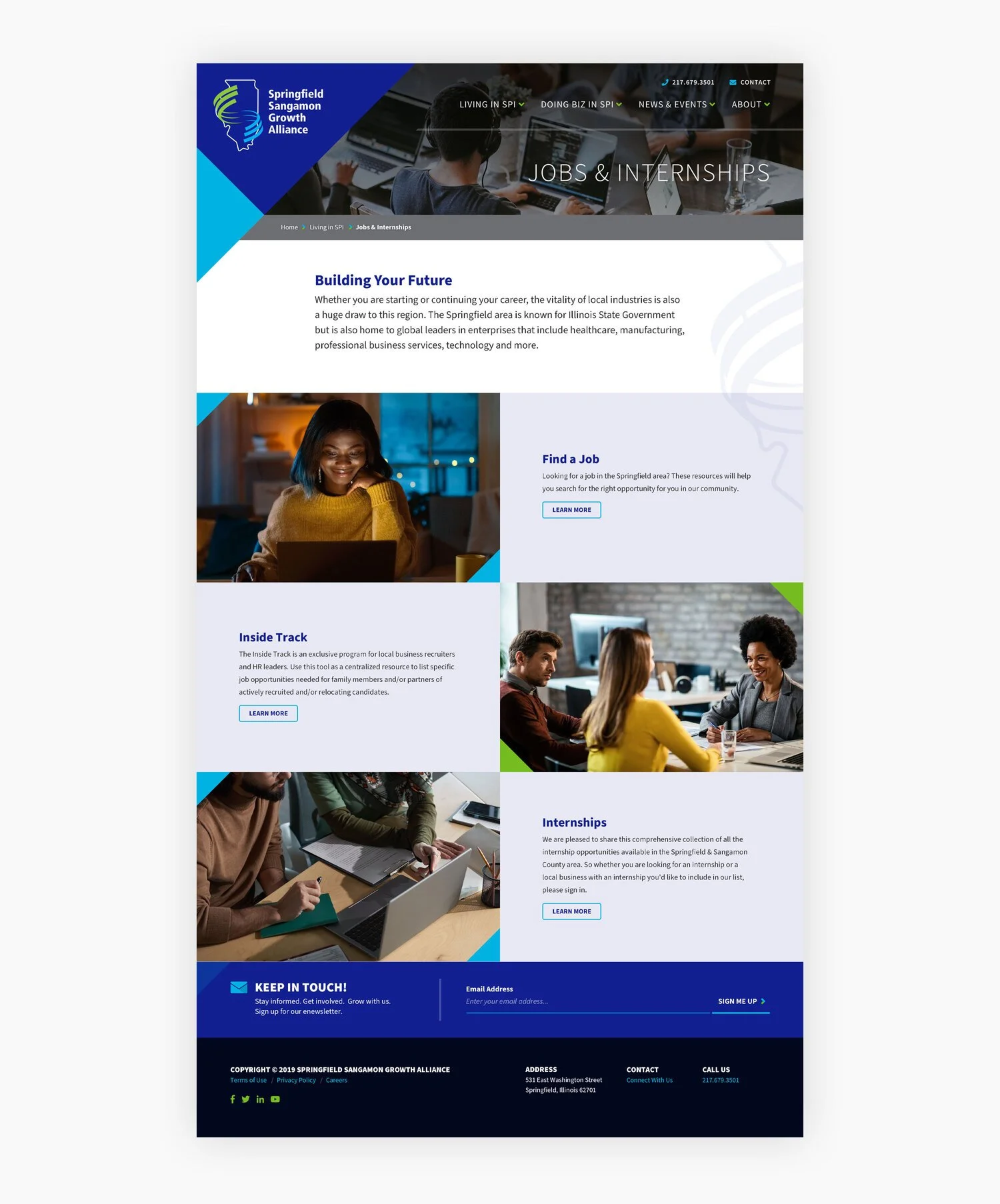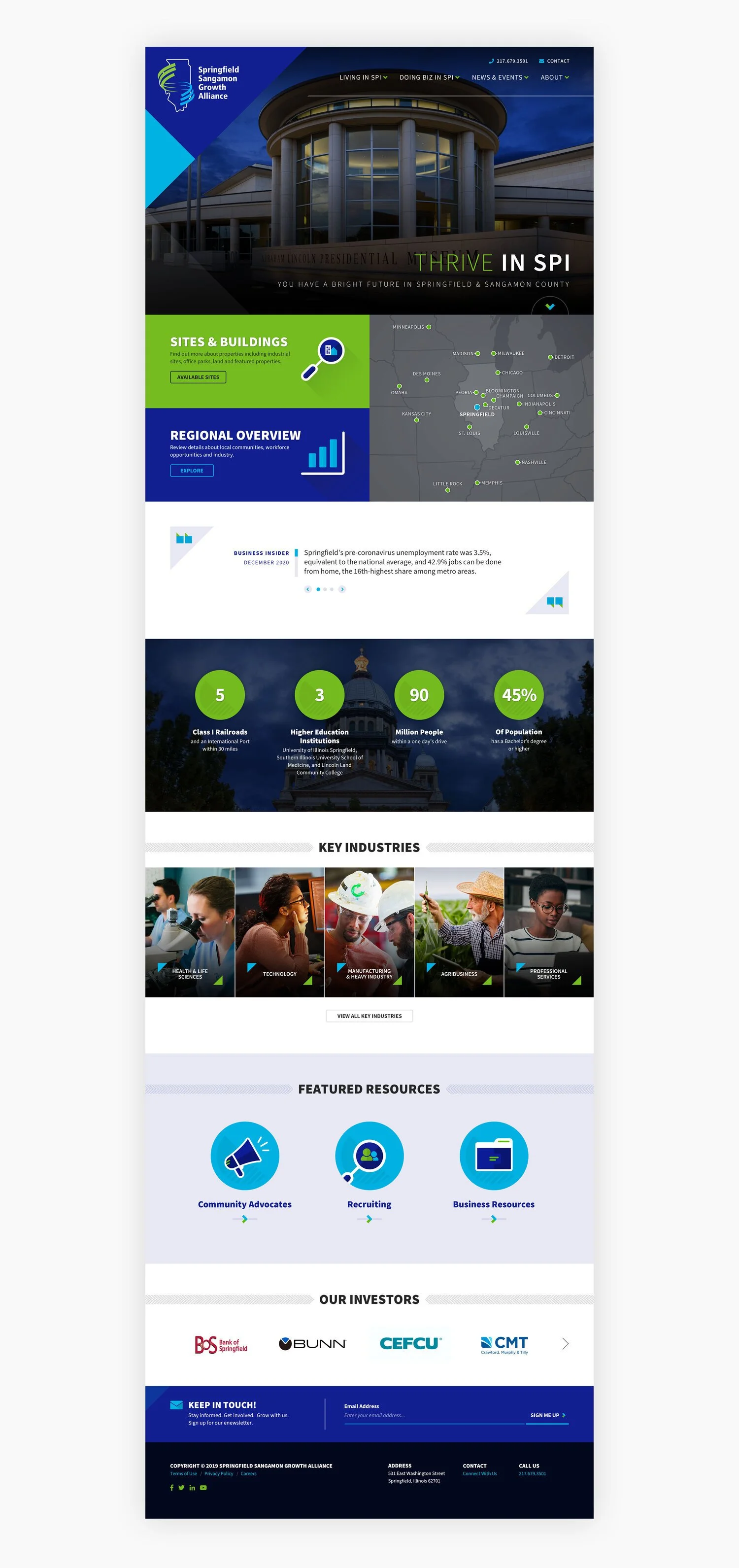 An organization dedicated to drawing new residents to the Illinois capitol called for a website that would express the energetic feel of the city through bold imagery, a dynamic layout, custom icons, and a regional map animation.